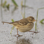 American Pipits are small, brownish, streaked birds that are sparrow-like in appearance, but with much thinner bills. Males and females look alike. They are slender, with gray-brown backs and buff-colored breasts. During the breeding season, their breasts may be streaked or unstreaked, but outside the breeding season, they are typically more heavily streaked.