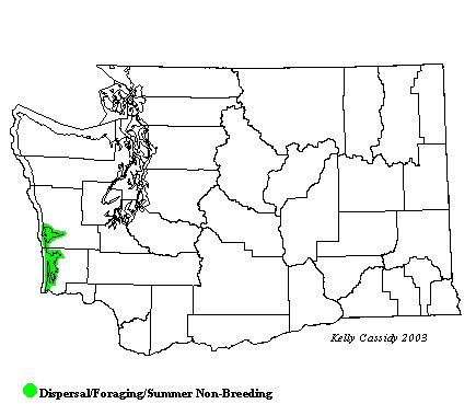 The Elegant Tern is a rare visitor to Washington from July to mid-September, along the southern outer coast in sandy habitats and offshore. In some years, Elegant Terns can be found in fairly good numbers in southwestern Washington locations, e.g. Ocean Shores (Grays Harbor County) and in Pacific County. They may be absent in other years.