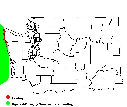 Colonies are located on five islands off the outer coast of the Olympic Peninsula, four in Clallam County and one in Jefferson County. Each colony ranges from 40 to almost a thousand breeding pairs. The birds are active at their nests at night, so it is very difficult to observe them on the breeding colonies. The best way to see Fork-tailed Storm-Petrels in Washington is on boat trips from April through October, when they are fairly common over the continental shelf.