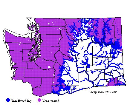 The Columbia Basin separates the two subspecies of Golden-crowned Kinglet that breed in Washington. In western Washington, the Golden-crowned Kinglet is one of the most common species of wet coniferous forests all the way to the outer coast. They are common year round in appropriate habitat, from the lowlands up to Snoqualmie and Stevens Passes. They can be especially abundant in the winter in the foothills and at mid-elevations. They are less abundant but still common in eastern Washington, where they breed in higher forests (above the Ponderosa pine zone) and migrate through the shrub-steppe zone.