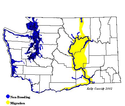 Greater Scaups are found during migration and winter in bodies of water in all lowland areas of Washington, although they are more common in salt water than they are in fresh water habitats. West of the Cascades, Greater Scaups start arriving in August and become common from September to mid-May, when most depart for northern breeding areas. Small numbers regularly summer in sewage ponds in western Washington. East of the Cascades they can be found from mid-October until mid-April before heading north.