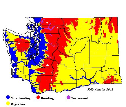 Hermit Thrushes are common at high elevations in coniferous forests throughout Washington. They usually replace Swainson's Thrushes at high elevations in the Cascade and Olympic Mountains, although they are less common in the wetter forests of the Olympic Peninsula. During migration, they are often found at lower elevations than when breeding. They are outnumbered by Swainson's Thrushes throughout most of Washington, except at high elevations in coniferous forests with limited brush, such as in the Blue Mountains.