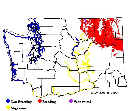 Red-necked Grebes are common breeders in the northeastern part of the state, especially in the lower river valleys. Valleys with confirmed nesting records include Curlew Creek, Kettle River, Columbia River, Deep Creek, Cedar Creek, Colville River, Sanpoil River, and Pend Oreille River. Throughout these valleys Red-necked Grebes are found on sloughs, ponds, lakes, and reservoirs, not on moving water. During winter they are common along the coast of Washington and in Puget Sound. They are seen fairly frequently in Lake Washington and several weeks annually in Lake Sammamish ((late November through December). Locations are American Lake, O.O. Denny Park, Sand Point, Kirkland, Marymoor Park, and Lake Sammamish State Park. Look for them in these same locations in March and April.