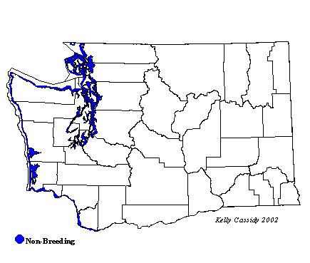 During winter, Red-throated Loons are fairly common on the inshore waters of the enclosed bays of Puget Sound. They can also be found at the mouths of large rivers. Migrant birds can be found at these same locations in both spring and fall, and occasionally, non-breeders are found there in summer. The spring migration peaks in late April to early May, with flocks gathering off the Washington coast. In fall, the migration peak is in late September and October. Red-throated Loons have bred as far south as Vancouver Island, so a Red-throated Loon breeding in Washington is a possibility, although there are no confirmed records for the state at this time.