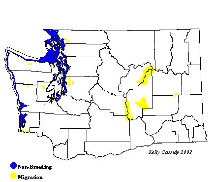 White-winged Scoters vary from uncommon to abundant along Washington's coastline and in Puget Sound from the late summer through spring (July through mid-June). Areas of abundance vary from year to year. White-winged Scoters are the most common scoter to be found on inland sites outside of the breeding season. Throughout Washington's lowlands, while still rare, White-winged Scoters may be seen on lakes and wetlands in late fall or early winter during migration. Flocks of non-breeders can also be seen in coastal areas in summer in some of the more heavily used winter locations such as Penn Cove off Whidbey Island and Drayton Harbor (Whatcom County).