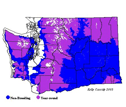 The Northern Goshawk is uncommon year round. It is most common along the eastern slope of the Cascades. It is less common in the Olympic Mountains, but can be seen occasionally in the higher points of this range.