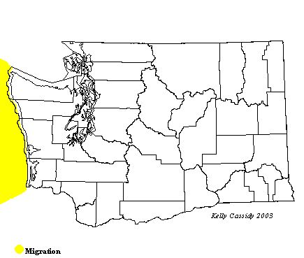 A pelagic boat trip, especially during migration, is the best way to see Red Phalaropes. Red Phalaropes are the least common of the two ocean-going phalaropes, seen about half as often on boat trips as Red-necked Phalaropes. They can sometimes be seen from the coast, or even on shore in puddles and ponds, after a storm. They are late migrants, and commonly stay in the waters off Washington until December. Juveniles are very rarely reported in eastern Washington in the fall. Offshore, they can be seen in any month of the year, but are rare for much of that time. Spring migrants start coming through in the beginning of May, and are common by the second half of May. The spring migration is condensed, and birds are uncommon by the beginning of June. They become common again in mid-July, as adults start migrating south, and they remain common into mid-November, as the young of the year follow the adults. They are still present, but uncommon, until the end of November, after which they become rare again until spring.