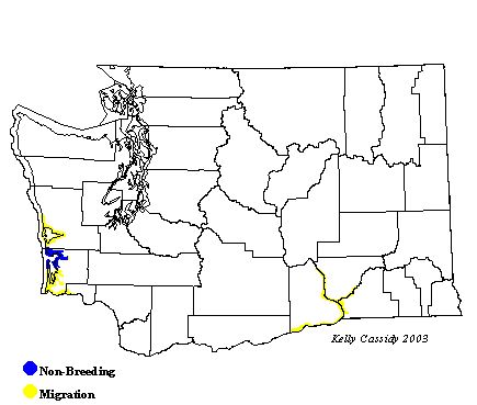 Small numbers of Willets winter every year in Willapa Bay (Pacific County) and on the mudflats at Tokeland, and may feed near the Raymond airport. Willets have not been known to breed in Washington, although they do breed in southern Oregon and Idaho. During migration they are rare along the coast (from mid-April to late May and from early July to mid-October) and in eastern Washington (from mid-April to late May and from mid-August to late September).