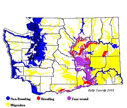 In winter, California Gulls can be found all along the coastline, and also well offshore. It is the only Pacific gull that follows offshore ships in the summer and fall. Small numbers can also be seen on water throughout the Puget Trough in the winter. (It is common from the end of March to early November in Washington.) Breeders can be found in the Columbia Basin and along the Columbia River in Klickitat County. In Grant County, there is a nesting colony by Dry Falls Dam. During summer, small numbers of non-breeders are seen throughout the Puget Trough and along the outer coast, especially at the mouth of the Columbia River. During migration, it is common in offshore, coastal, and western Washington regions. Migrants have also been reported at high elevations throughout the Cascades.