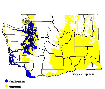 The Long-billed Dowitcher is less common during migration than the Short-billed Dowitcher, but is the more common winter resident in major estuaries on the Washington coast and in Puget Sound. It is generally absent from eastern Washington in winter. Coastally, the first adult migrants start arriving from the north in July and are common from July into mid-September. Juveniles start migrating through in mid-August and are common through October. They are uncommon from November through April. The spring migration is short, and birds are common for only a few weeks in the beginning of May. They taper off to uncommon in late May, and by June they are reported only occasionally. In eastern Washington, they are rare in late June, but quickly become common in July and remain so through October. They are uncommon in November, rare in December, and only occasionally spotted from January through March. In April, numbers start migrating through again, but they are still uncommon. The migration builds in May, and they are common for most of that month. This is a short period, and by the end of May they are uncommon, and by the second half of June they are rarely reported.