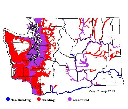 Migration is variable throughout the range. Wintering grounds for migrating birds can be found throughout the southwestern United States, in pockets of the southeast United States, and in Mexico. Eastern Washington populations are migratory, while west-side birds are resident.