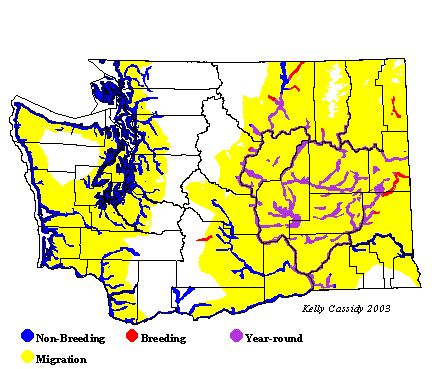 Northern Pintails are uncommon breeders in freshwater ponds and wetlands in the central Columbia Basin. The majority of Pintails breeding in Washington can be found in southern Grant and Adams Counties. In western Washington, some birds breed in less-developed parts of the southern Puget Trough, but summer sightings are most often non-breeders. During migration and winter, Northern Pintails are very common birds on the coast and in Puget Sound. They are most common in western Washington from late August to early May. In eastern Washington, they may be found all year.