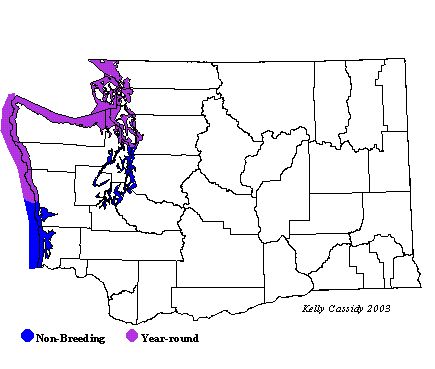 Washington's population of over 60,000 Rhinoceros Auklets nests at three main sites: Protection Island, Destruction Island, and Smith Island. Smaller numbers nest at a few other sites. The major colonies in Washington make up over 90% of the US population south of Alaska. Rhinoceros Auklets are common from February through September around islands of the outer coast of Washington and in inland marine waters. The rest of the year, they can be found in similar habitat, although less commonly. They forage closer to shore than their near-relatives, Tufted Puffins.