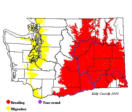 During the breeding season they can be found throughout the Columbia Basin, to the foothills of the Blue Mountains, and up into the broad river valleys of the northeastern corner of the state. They are most conspicuous during the beginning of the breeding season in March and April when they call actively. Wintering birds can be found throughout eastern Washington, especially along the Snake and Columbia Rivers where single birds occur every few years. They are uncommon to rare in the western Washington lowlands during migration, in March.