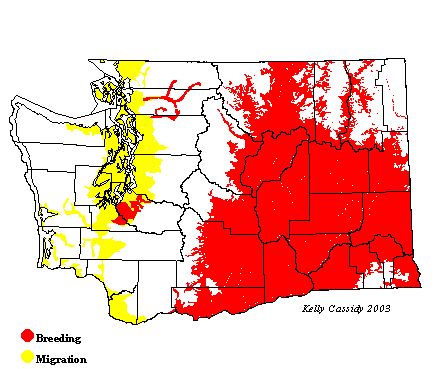 Western Kingbirds are common from May to August in the open lowlands of eastern Washington, especially in farmland. In western Washington, they are rare breeders, with breeding confirmed in Pierce, Skagit, and Whatcom Counties. Migrants can also be seen rarely throughout western Washington including the outer coast during the spring and fall.